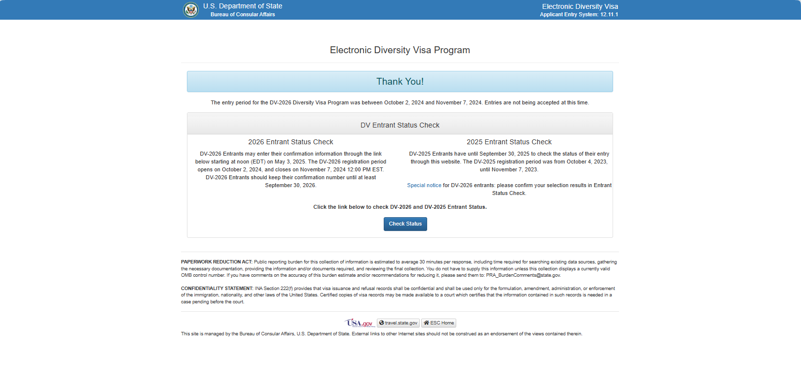 Le programme de visa de diversité (DV) 2027 porte le nom de l’année où les gagnants peuvent s’installer aux États-Unis, même si la loterie a lieu en 2025. En effet, le gouvernement a besoin de temps pour sélectionner les gagnants et traiter leurs demandes de visa.